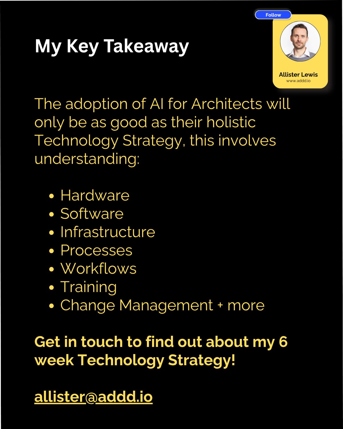 The adoption of AI for Architects will only be as good as their holistic Technology Strategy. This involves understanding: