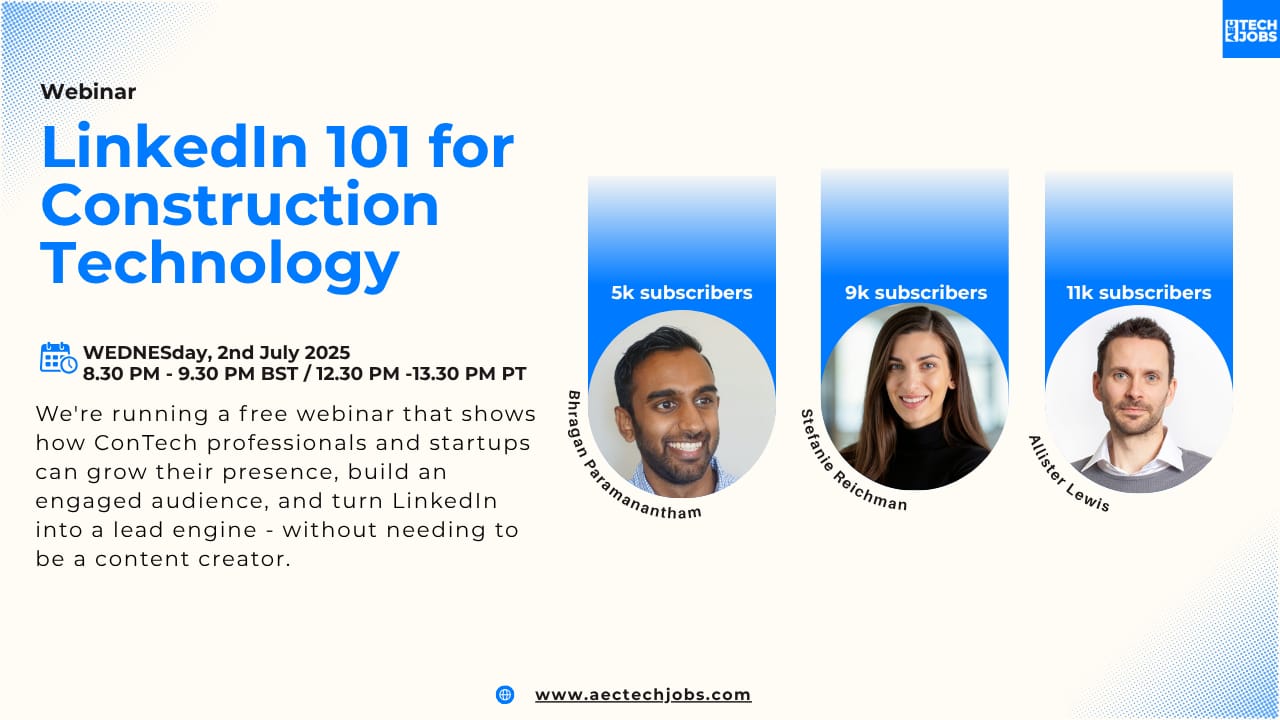 Want to Move into ConTech? Check out AEC Tech Jobs - all the best new roles from Computational Designer, Product Manager, Software Developer, Marketing and Sales are all here. Join one of the fastest growing industry out there for ConTech roles.
